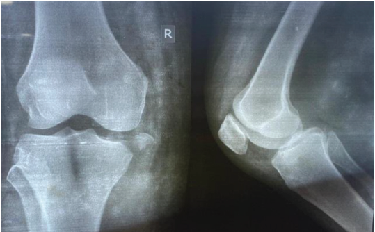 Figure 2: Anteroposterior and lateral view of radiograph of the knee showing medial condyle fracture with medial collateral ligament avulsion.