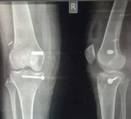 Figure 3: Post-operative anteroposterior and lateral view of radiograph of the knee showing medial condyle fracture fixed with cannulated cancellous screws in the distal femur and proximal tibia.