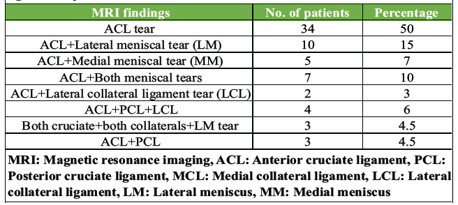 Table 1: MRI findings after the injury, showing the combination of knee ligament injuries