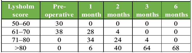 Table 3: Lysholm scores at pre- and post-operative intervals