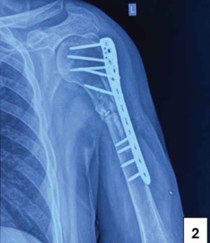 A 5 cm segment of the fibula was harvested from the middle third of the contralateral leg and split longitudinally into four pieces. The entire length of each fibular strut was then inserted into the medullary canal of the humerus. The non-union site was then reduced and stabilized with an 8-hole proximal humeral interlocking plate in compression mode. Cancellous bone graft, obtained from the ipsilateral iliac crest, was placed at the non-union site. An intraoperative tissue sample was obtained and sent for culture. The wound was closed in layers, and an antiseptic dressing was applied.