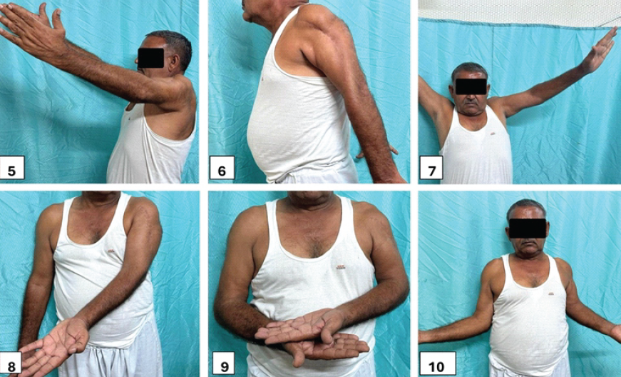 Postoperatively, the limb was immobilized with a universal shoulder immobilizer. There were no post-operative neurovascular deficits. The first post-operative dressing was performed on day 3, with suture removal on day 14. A staged rehabilitation program was initiated, beginning with passive pendulum exercises from the 3rd post-operative week onward. Assisted range of motion exercises were introduced from the 5th week, progressing to active range of motion exercises from the 9th week. At 6 months postoperatively, his shoulder range of motion included 110° of flexion, 30° of extension, 130° of abduction, 25° of adduction, 60° of internal rotation, and 35° of external rotation (Figs. 5, 6, 7, 8, 9, 10]. Elbow flexion was restored to 0–135°. Constant Shoulder Score improved to 80, indicating a good functional outcome. X-ray at 6 months showed a callus bridge across the non-union site (Fig. 2).
