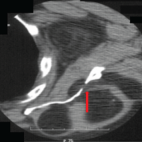 A physical examination revealed significant paravertebral muscle spasms and contracture in the absence of neurologic deficit. Imaging studies revealed that LTV with contact between the L5 transverse process and sacral ala was compatible with symptomatic pseudoarticulation. For diagnostic confirmation and therapeutic purposes, a selective corticosteroid injection was performed within the contact area between the L5 mega-transverse process and the left iliac wing, which achieved complete pain relief. However, pain recurred on the 3rd post-operative day. Thus, surgical management was indicated with resection of the mega-transverse process aided by neuronavigation. Adequate osteotomy was confirmed through an intraoperative CT scan. Post-operative evolution was favorable and complete pain resolution was achieved.