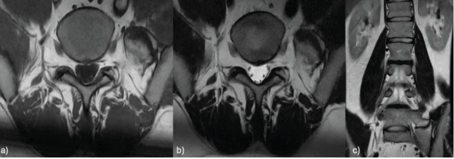 Figure 1: Lumbar magnetic resonance imaging in axial T1 (a) and T2 (b) sequences and coronal T2 (c) sequences showing subchondral edema at the contact area between the left L5 mega-transverse process and the sacrum.