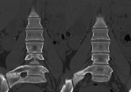 Figure 3: Computed tomography scan of the lumbar spine in the coronal view: Right L5 mega-transverse process pseudoarticulated with the sacrum.