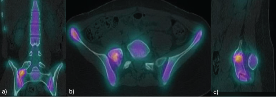 Figure 4: Single-photon emission computed tomography-computed tomography of the lumbosacral region: Focal area of increased uptake at the pseudoarticulation between the right L5 mega-transverse process and the sacrum in the coronal (a), axial (b), and sagittal (c) views.