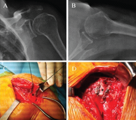 Figure 1: Pre-operative radiograph and anterior latissimus dorsi tendon transfer. (a) Anteroposterior and (b) axil radiograph of left shoulder showing no arthritic change in 61-year-old woman. (c) The latissimus dorsi tendon (asterisk) is harvested and prepared with Krackow suture. (d) The latissimus dorsi tendon (sterisk) is transferred to the lesser tuberosity.