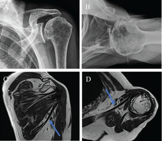 Figure 2: Radiographs and magnetic resonance imaging 10 years after anterior latissimus dorsi tendon transfer. (a) Anteroposterior and (b) axil radiograph of left shoulder demonstrating advanced glenohumeral osteoarthritis with joint space narrowing and superior migration of the humeral head. (c) Coronal and (d) axial T2-weighted magnetic resonance image showing well-preserved transferred latissimus dorsi tendon attached to the lesser tuberosity.