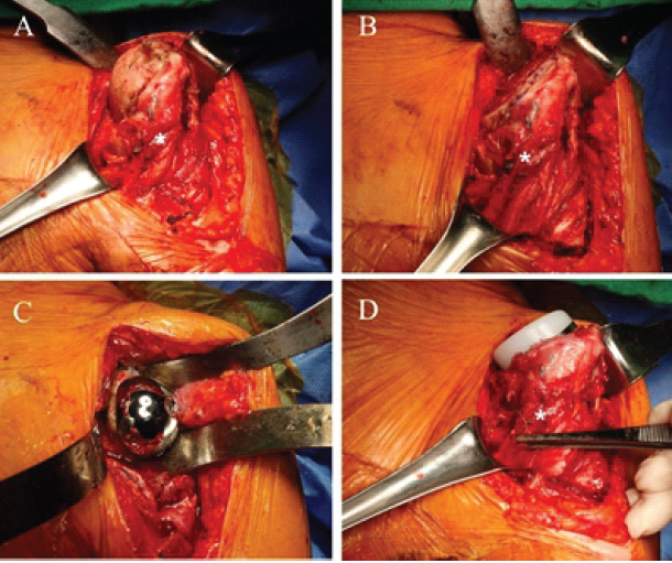 Figure 3: Conversion to reverse total shoulder arthroplasty with preservation of the anterior latissimus dorsi transfer (LDT). (a) Intraoperative photograph showing the preserved LDT at its insertion on the lesser tuberosity, where it is visualized and confirmed to be firmly and securely attached. (b) The humeral head osteotomy is performed just superior to the latissimus dorsi tendon insertion and the greater tuberosity. (c) The baseplate is implanted in the inferior portion of the glenoid with an intentional inferior tilt to minimize scapular notching and optimize stability. (d) The humeral stem is inserted with preservation of the LDT.
