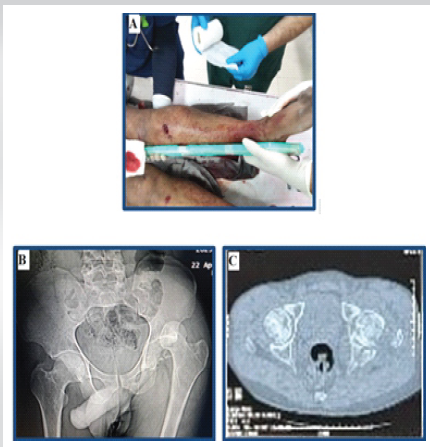 Figure 1: Compound fracture of the tibia with posterior dislocation of the hip in a polytrauma case (a). Posterior dislocation of the left hip with comminuted fracture of the posterior wall of the acetabulum (b). Computed tomography scan showing incarcerated posterior wall fragment in the left hip joint (c).