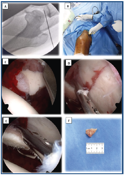 Figure 2: Arthroscopic-assisted removal of an incarcerated fragment from the hip joint. Identification of joint space under fluoroscopy for proper portal positioning (a and b). Assessment of joint congruency and removal of the incarcerated fragment (c, d, e). Extracted bone fragment (f).