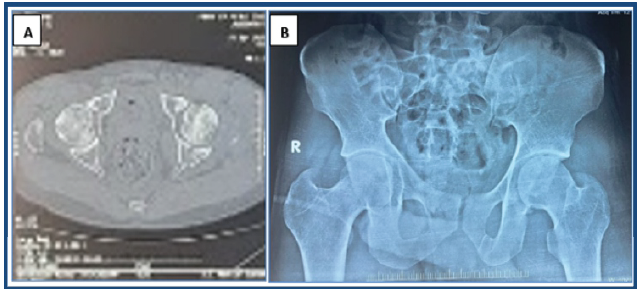 Figure 3: Post-operative computed tomography scan (a) and X-rays (b) showing a congruous left hip joint.
