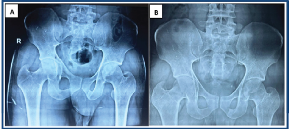 Figure 4: Follow-up X-ray after 4 weeks (a) and after 8 weeks (b) showing congruous left hip joint and uniting fracture of the posterior wall of the acetabulum.