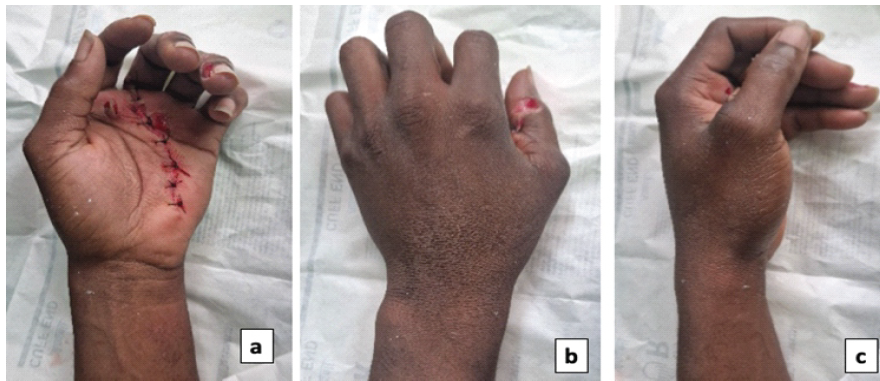 Figure 1: Clinical presentation of the left hand (a) Palmar side of the left hand showed a superficial volar wound measuring approximately 7 cm, concave in shape, extended from the base of the third finger to the thumb, forming a conjoined palmar flap. (b and c) lateral and dorsal side of the left hand showed dorsal concavity deformity of the left hand and posterolateral deformity of the thumb at the interphalangeal joint, with a 2-cm open wound at the base of the distal phalanx