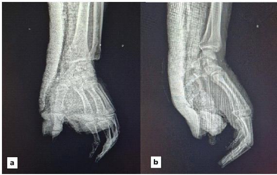 Figure 4: immediate post-operative radiographs. (a) Anteroposterior and lateral (b) views confirming stable reduction of the carpometacarpal and interphalangeal dislocations after closed reduction and immobilization with an anterior splint including the thumb column.