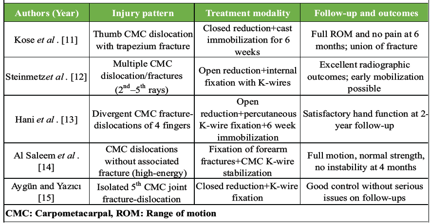 Table 1: Review of literature on carpometacarpal dislocations: Treatment modalities and outcomes