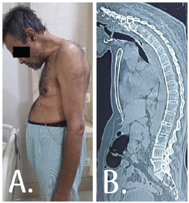 Ankylosing spondylitis (AS) is a chronic inflammatory disease characterized by progressive ossification of spinal ligaments, resulting in a rigid kyphotic spine. This rigidity, combined with osteoporosis, predisposes patients to unstable spinal fractures, even after minor trauma [1,2]. These fractures are often missed or diagnosed late due to altered anatomy and can lead to neurological decline or pseudoarthrosis if untreated [3]. Conventional strategies focus on fracture fixation with or without deformity correction. While intraoperative manipulation at the fracture site has been described [4,5], such methods may be inadequate in global deformity or when fractures occur distant from the kyphotic apex. This case highlights a novel approach – thoracic osteotomy remote from the fracture site – to correct deformity and stabilize the cervical fracture simultaneously.