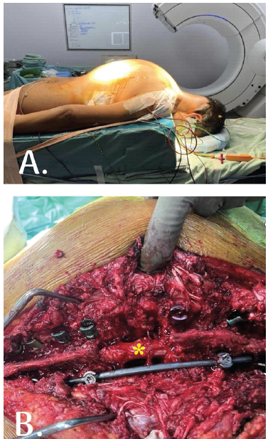 Figure 2: (a) Patient positioning in prone frame with head secured prior to osteotomy. (b) Intraoperative image demonstrating vertebral column resection at D5 (asterisk), with long posterior instrumentation extending cranially to stabilize the cervical fracture and caudally to D10.
