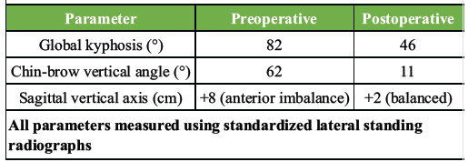 The patient reported improved horizontal gaze, the ability to ambulate independently, and return to daily activities. Although validated functional outcome scores such as the Oswestry disability index and SF-36 were not recorded, clinical assessment confirmed improved posture and mobility.