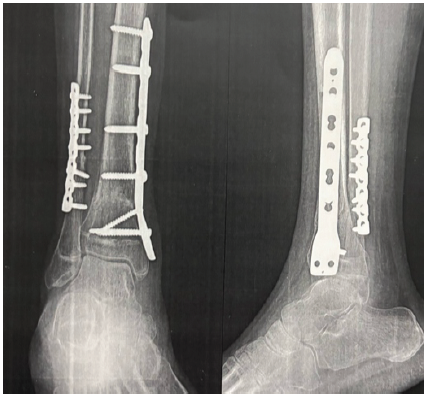 A 16-year-old male presented with complaints of persistent deformity of the right great toe and other toes, associated with discomfort during walking and difficulty wearing closed footwear. He had allegedly sustained a closed distal tibia and fibula fracture 3 years prior, which was managed with open reduction and internal fixation. The patient noticed the onset of great toe deformity approximately 3 weeks postoperatively, with increasing severity over time. Despite conservative measures, including physiotherapy, the deformity persisted and began to interfere with daily activities. On clinical examination, there was a visible dynamic flexion deformity of the right great toe that accentuated with active or passive dorsiflexion of the ankle and resolved on plantarflexion. The other toes also had dynamic flexion. The limb was neurovascularly intact. Radiographs of the leg and foot showed well-healed fractures with intact implants (Fig. 1 and 2).