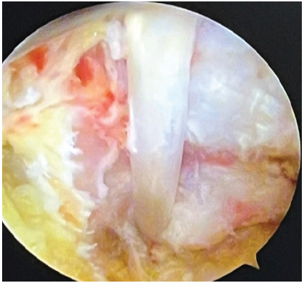 A 4.0-mm 30° arthroscope was introduced through the posterolateral portal. The FHL tendon was visualized at the level of the posterior ankle, just posterior to the talus. Dynamic testing by flexion of the great toe was performed to confirm the tightness and tethering of the FHL tendon during passive dorsiflexion of the ankle (Figs. 4 and 5).