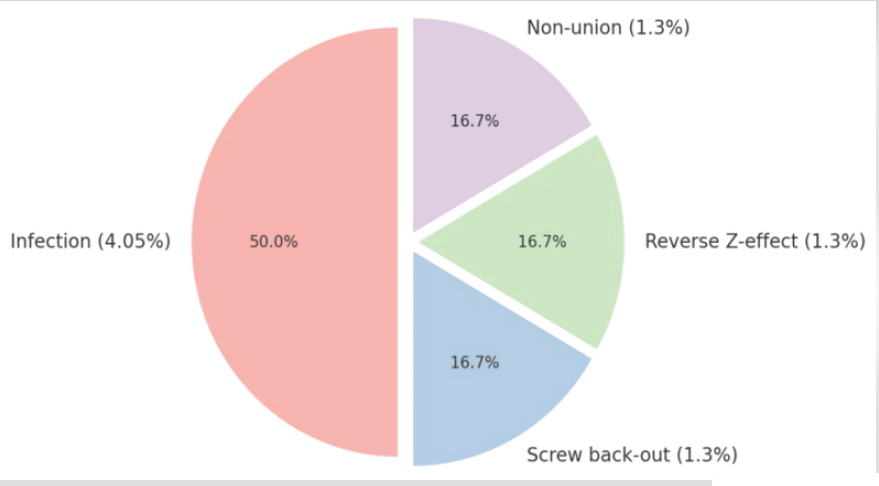 Various post-operative complications are seen in follow-up (Fig. 1). The overall rate was 8%, with superficial infection (4.05%) being the most common. Other isolated events included one each of screw back-out, reverse Z-effect, and non-union (1.3% each). No implant breakage, deep infection, or intraoperative fracture was encountered. These findings are in agreement with prior studies [12,13] reporting complication rates ranging from 8% to 10%.