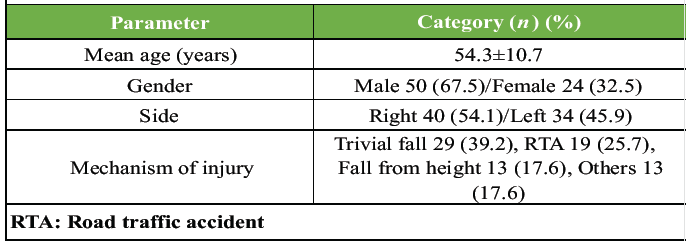 A total of 74 patients were included (Table 1). The mean age was 54.3 ± 10.7 years (range 27–80), with most (28.2%) in the 51–60-year age group, reflecting the prevalence of osteoporotic fragility fractures. There was a male predominance (67.5%), likely due to higher trauma exposure. The right side was involved in 54.1% of cases. Trivial falls (39.2%) were the most common cause, followed by RTAs (25.7%).