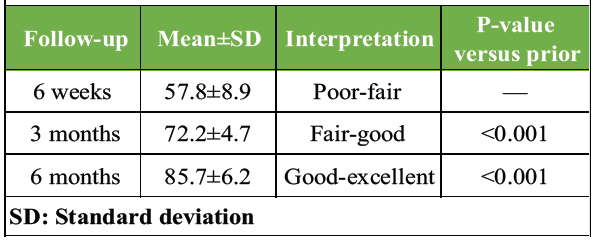 Table 3: Functional outcome assessed by the Harris hip score at 6-week, 3-month, and 6-month follow-ups