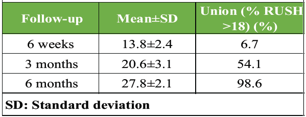 Radiological healing was assessed using the RUSH at each follow-up (Table 4). The mean RUSH score was 13.8 ± 2.1 at 6 weeks, 20.6 ± 3.2 at 3 months, and 27.8 ± 2.4 at 6 months, indicating progressive callus formation and cortical bridging across fracture sites (P < 0.001). The mean improvement in RUSH score from 6 weeks to 6 months was 14.0 points (95% CI: 12.9–15.1), corresponding to a very large effect size (Cohen’s d = 2.96), confirming excellent radiological progression and strong evidence of union.
