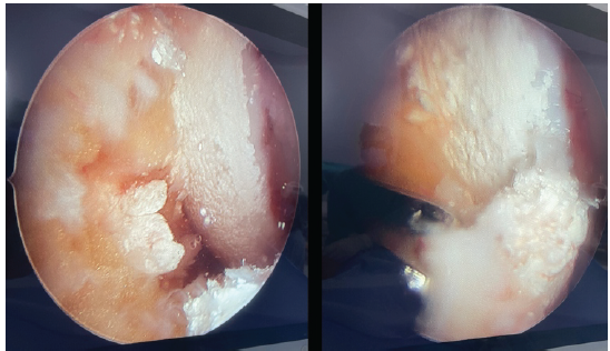 He had no other palpable gouty lesion in the body. He had an elevated serum uric acid of 13.4, with other normal blood parameters. The patient had a pre-operative Lysholm knee score of 35/100. MRI revealed Arthrofibrosis with lateral meniscal tear with mucoid degeneration of anterior cruciate ligament (ACL) with synovitis. The report did not mention any evidence of chondrocalcinosis. Due to the patient’s chronicity of mechanical symptoms and meniscal tear, the patient was taken up for diagnostic arthroscopy. The arthroscopic examination revealed synovitis with widespread chalky deposits over the chondral surfaces, menisci, fat pad, ACL and synovium in the suprapatellar pouch and intra-articularly. (Fig. 2).