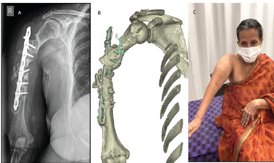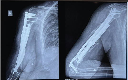 We report the case of a 70-year-old healthy, active female who was treated for a right humerus fracture with locking compression plate fixation 6 years back from an outside hospital presented to us with nonunion of the shaft of the humerus with bone loss and severe functional disability of the right upper limb. Clinically she had painless abnormal mobility at fracture site. Her shoulder joint movements were restricted, with abnormal mobility occurring at the fracture site each time she tried lifting her shoulder. There were no signs of local infection, skin breakage. She had no other comorbidities, and was not taking any medications. Radiological evaluation showed atrophic Non-union of the humeral shaft with significant bone loss. Computed tomography scans with 3D reconstruction showed osteolysis of the humerus shaft with 13.68 cm of bone loss(Fig.1). Routine blood investigations, erythrocyte sedimentation rate, and C-reactive protein were done to rule out infections.