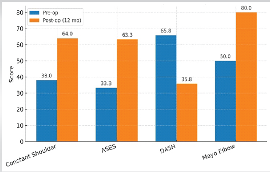 It was found out that Constant Shoulder Score improved from of 38 preoperatively to post-operative 64, the American Shoulder and Elbow Surgeons score improved from 33.3 to 63.3 postoperatively, Disabilities of the Arm, Shoulder and Hand score had pre-operative average of 65.8 and post-operative average of 35.8 and Mayo Elbow Performance Score had pre-operative average of 50 and post-operative average of 80 measured at 12 months post-operative (Fig.5).