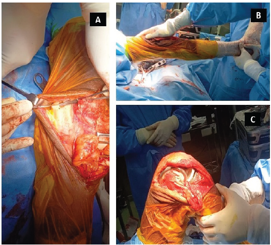 Figure 2: Pie-crusting of posterior part of Iliotibial band (a); Trialing of implants (b); and final cementing of prosthesis (c).