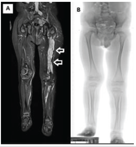 Figure 1: (a) Magnetic resonance imaging of both lower limbs showing extensive plexiform neurofibroma infiltration in the soft tissues of the left lower limb compared to the unaffected right side. (b) Standing radiograph, demonstrating limb length discrepancy, with the right lower limb being shorter by 4.5 cm.