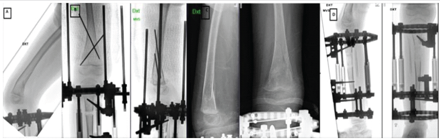 Figure 2: Anteroposterior and lateral radiographic views of the right lower limb during tibial lengthening using a circular external fixator.