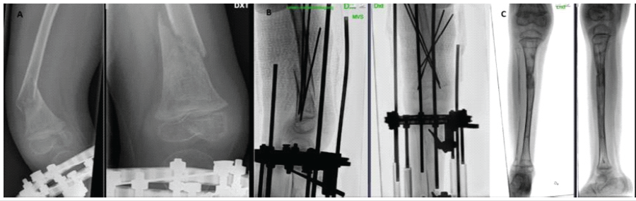 Figure 4: (a) Refracture at the right distal femur 2 months after plaster and K-wire removal (b) Fracture fixation with K-wires and plaster (c) Valgus deformity of the right lower limb.