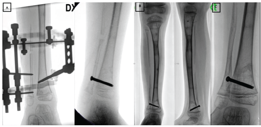 Figure 5: (a) Bone lengthening of the right distal fibula (b) Proximal migration of the right distal fibula (c) Proximal fibular migration due to screw cut-out and fixation failure.