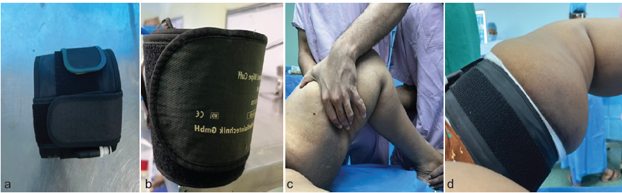 .As opposed to a cylindrical tourniquet (Fig. 1a), a conical tourniquet (Fig. 1b) was used in all patients. Krackow maneuver (Fig. 1c) was utilized to achieve a high tourniquet position (Fig. 1d) with adequate padding. Tourniquet length was selected such that the inflatable portion of the cuff completely encircles the limb. Tourniquet was inflated 150 mmHg above systolic blood pressure.