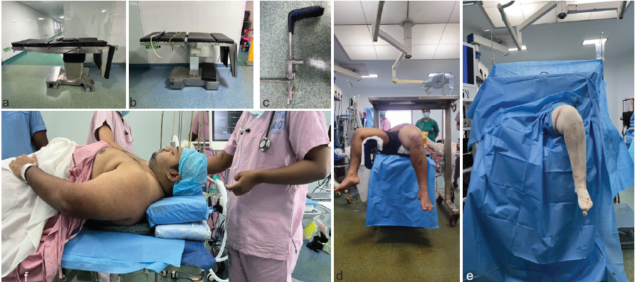 Figure 2: (a) Obesity table – note how much thicker the base and the rails are (b) Normal table (c) Custom made adjustable leg holder which can be clamped to the table (d) Ramp up position achieved with pillows (e) Leg hanged down by bringing the leg holder down with opposite limb in abduction (f) After final draping.
