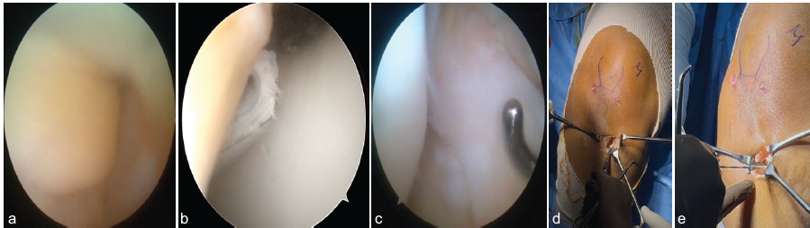 Figure 3: (a) Excess Fat pad obstructing view of the notch (b) Resection started from extension with shaver anterior to trochlea (c) Clear view of the notch after completion of resection (d) Sartorius fascia reflected and held with Kocher’s in an open wallet fashion (e) Semitendinosus tendon snared with number 2 ethibond.
