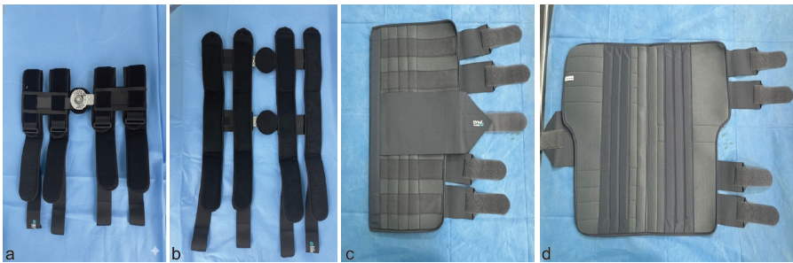 Figure 4: (a and b) adjustable range of motion knee brace. (c and d) standard long leg knee brace.