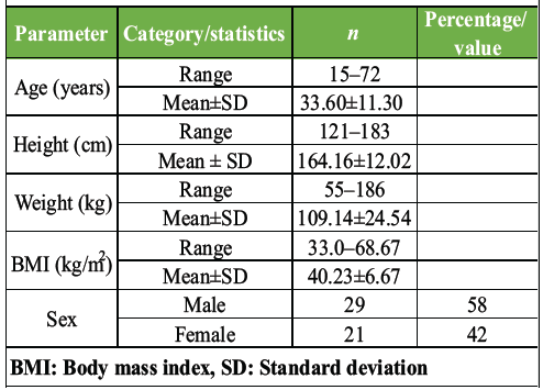 The cohort predominantly consisted of young adults, with a mean age of 33.6 years and a mean BMI of 40.23 kg/m2. Males constituted 58% of the study population (n = 29), while females accounted for 42% (n = 21). About 70% of patients had no significant comorbidities; among those with associated conditions, bronchial asthma, hypothyroidism, and hypertension were the most frequently observed (Table 1).