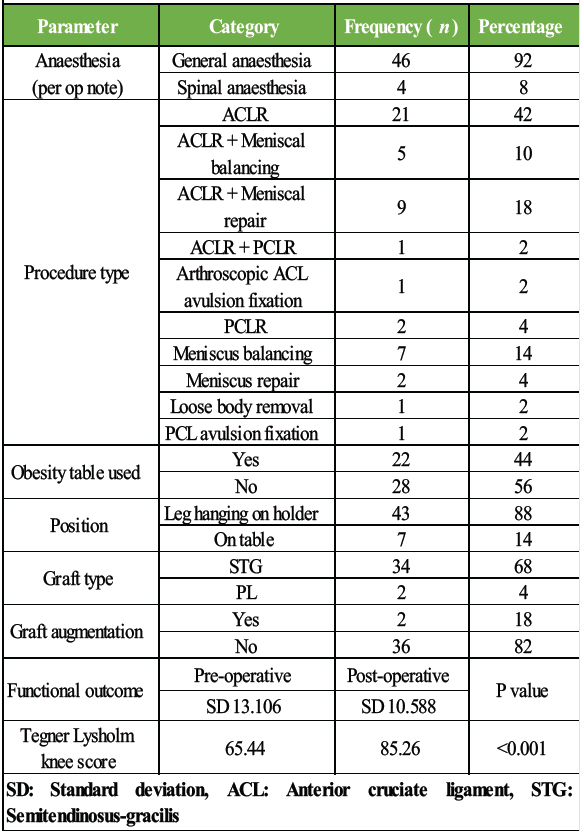 This is a retrospective study conducted at a high-volume tertiary care center specializing in arthroscopy and sports injuries to evaluate the perioperative challenges and post-operative functional outcomes in morbidly obese patients undergoing arthroscopic knee surgery. It included surgeries performed between January 2021 and December 2024, ensuring a minimum post-operative follow-up of 1 year for all eligible patients. Medical records were analyzed for demographic details, perioperative complications, and follow-up outcomes. Patients aged 18 years and above with a BMI ≥35 kg/m2, who underwent arthroscopic knee surgery and had complete records with a minimum follow-up of 1 year, were included. Functional outcomes were assessed using the Lysholm Knee score and Tegner activity scale, both of which are validated and reliable patient-reported outcome measures for assessing functional recovery and early return to sport following arthroscopic knee surgery [5]. Exclusion criteria included patients with BMI <35 kg/m2, incomplete medical records, open or revision procedures, and those with inflammatory or neuromuscular disorders. Purposive sampling was used to include all eligible patients during the study period. Only those fulfilling all inclusion criteria with available surgical and follow-up data were selected. Descriptive statistics were used to summarize data. The Statistical Package for the Social Sciences version 26 was used for analysis. Institutional ethics approval was obtained, and informed consent was obtained from all patients. A total of 50 patients were included, based on availability during the study period. No comparative or control groups were included. All patients formed a single cohort. Subgroup analysis was done based on comorbidities and procedure types where relevant. As this was a retrospective, single-center observational study, a formal sample size calculation was not performed. The sample size was determined by the total number of consecutive morbidly obese patients who underwent arthroscopic knee surgery during the study period and met the inclusion criteria. Inclusion of all eligible cases was intended to minimize selection bias and to provide a representative description of perioperative challenges encountered in routine clinical practice.