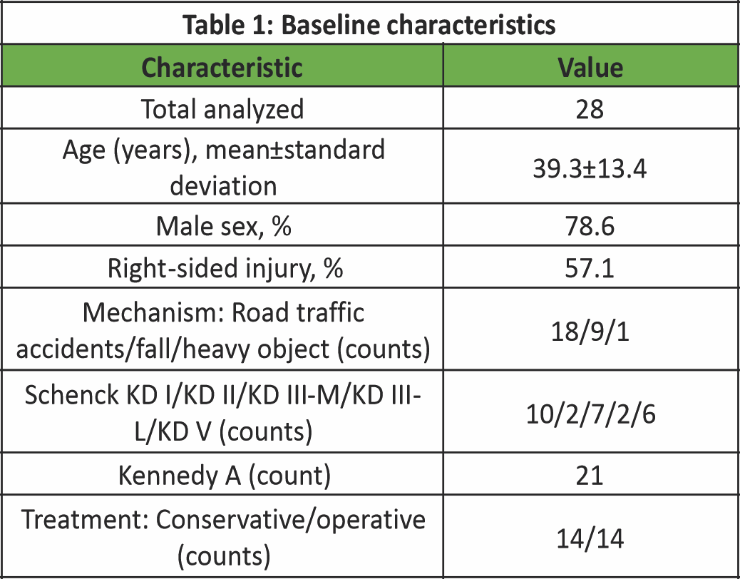 Of the 28 patients analyzed (conservative = 14 and operative = 14), the mean age was 39.3 ± 13.4 years; 78.6% were male. Most injuries were caused by RTAs (64.3%), with falls accounting for 32.1%. The right knee was affected in 57.1% of cases. By classification, Kennedy type A dislocations predominated (75.0%), and Schenck KD I injuries were most common (35.7%) [Table 1] [Fig. 2].