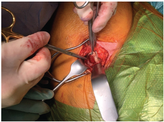 Figure 1: The torn proximal hamstring tendons are presented after mobilization. The scissors are pointed pointing toward the ischial tuberosity where the anchors will be placed.