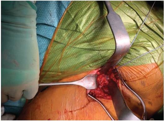 Our surgical approach is based on the method described by Moatshe et al. [10], with minor modifications. Patients were positioned prone under general anesthesia to provide optimal access to the posterior thigh and gluteal region. A 5–8 cm transverse incision along the gluteal crease provided access to the ischial tuberosity and minimal cosmetic impact. After identifying the inferior border of the gluteus maximus muscle, the inferior gluteal fascia was incised to allow for proximal mobilization of the muscle. The ischial tuberosity and overlying fascia were then identified, and the fascia was opened. In acute injuries, any large hematoma and associated fluid were evacuated at this point. The avulsed hamstring tendon stumps were then identified, mobilized proximally, and provisionally secured with two strong sutures (Fig. 1).
