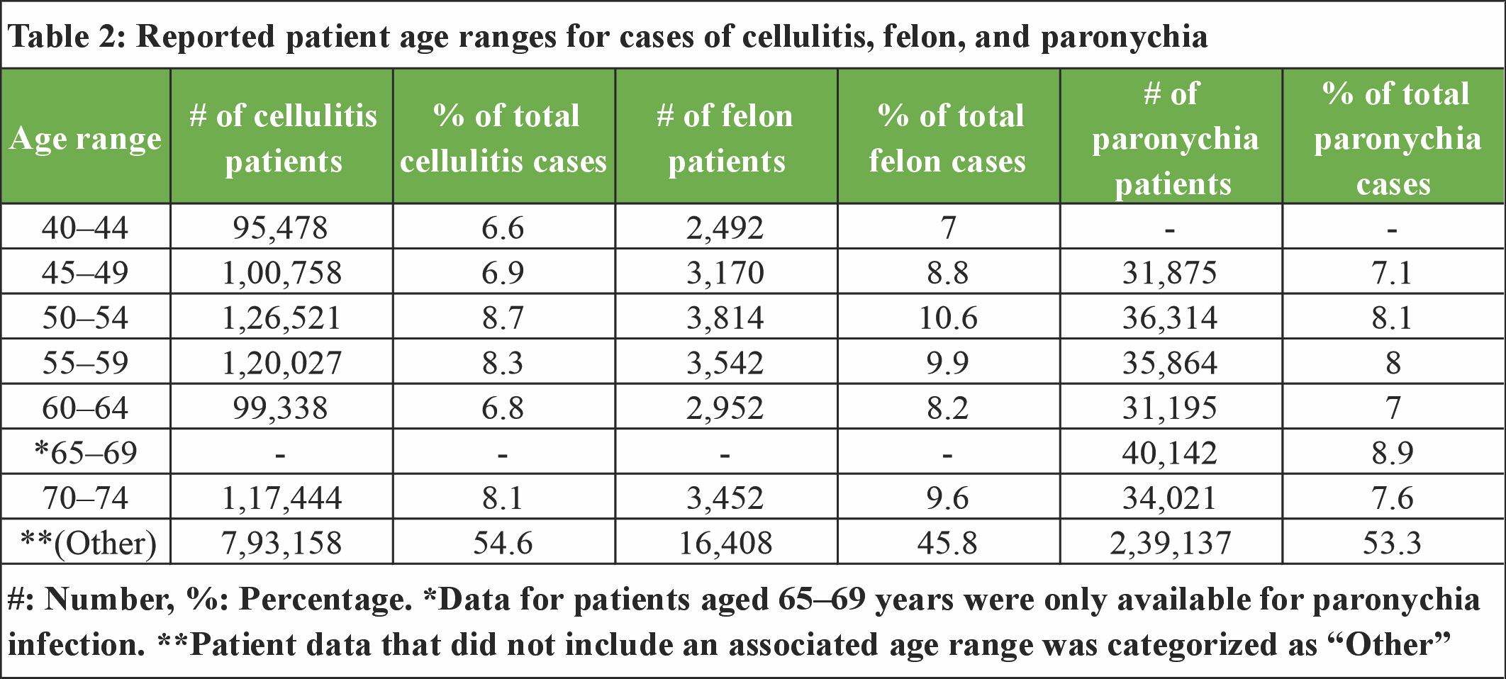 Table 2: Reported patient age ranges for cases of cellulitis, felon, and paronychia