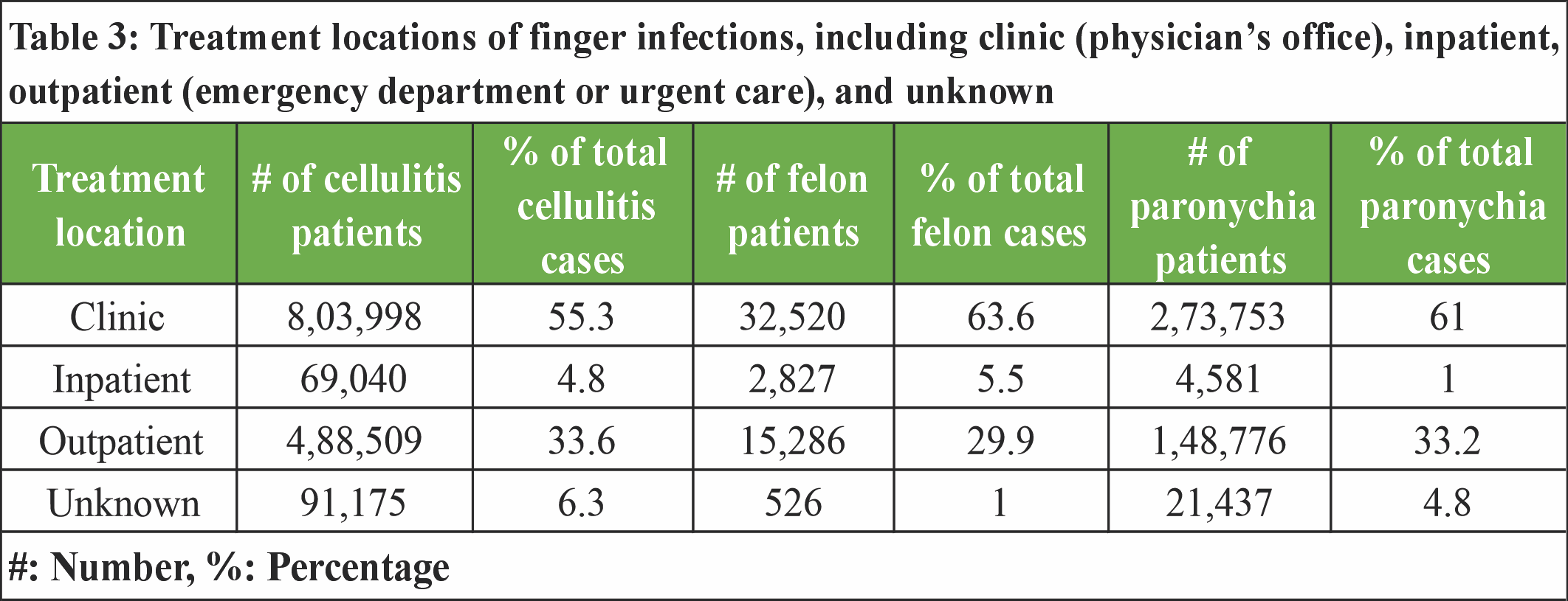 Table 3: Treatment locations of finger infections, including clinic (physician’s office), inpatient, outpatient (emergency department or urgent care), and unknown