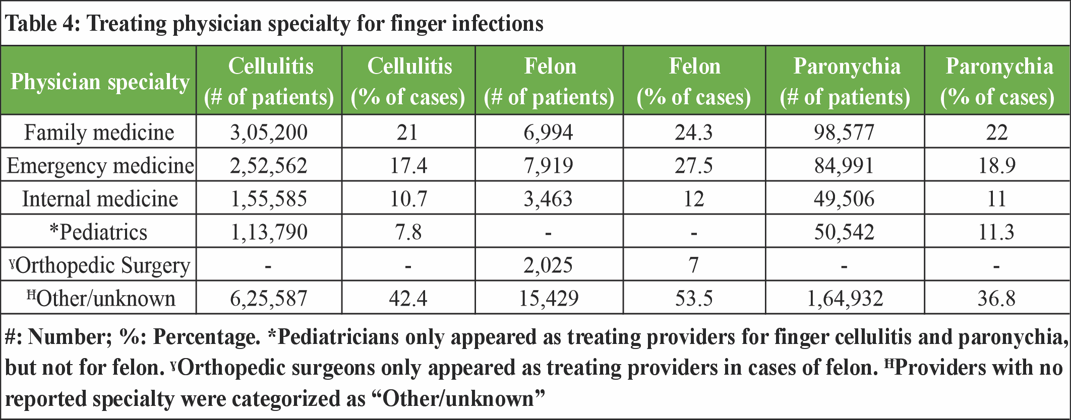 Of the specialties, family medicine physicians treated the highest percentage of finger infections (21% of cellulitis, 19.5% of felons, and 22% of paronychias), followed by emergency medicine (17.4% of cellulitis, 22.1% of felons, and 19% of paronychias) and internal medicine (10.7% of cellulitis, 9.7% of felons, 11% of paronychias). Pediatricians treated 7.8% of cellulitis cases and 11.3% of paronychias. However, pediatrics was not included as one of the treating provider types for felons. Similarly, 5.7% of felons were treated by orthopedic surgeons, but the dataset did not explicitly list orthopedic surgeons as a provider type for cellulitis or paronychia. Infections not treated by one of the aforementioned physician specialists were categorized as “Other/unknown” provider type (44% of cellulitis, 43% of felon, and 25.2% of paronychia).