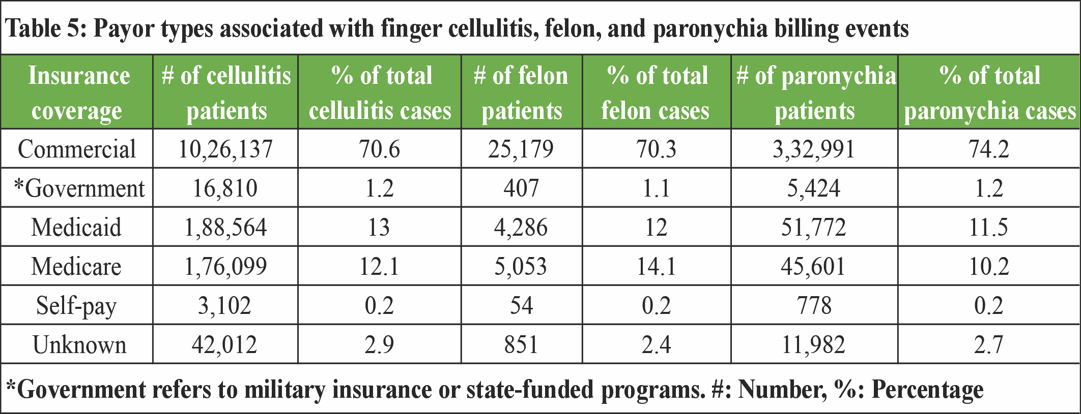 Table 5: Payor types associated with finger cellulitis, felon, and paronychia billing events